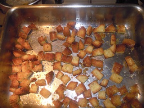 tagliare le fette di pane a dadini, metterli in una teglia e condirli con olio, sale, pepe ed origano. cuocere in forno sotto al grill. dopo un paio di minuti mescolarli bene e rimetterli in forno fino a che non sono ben dorati.