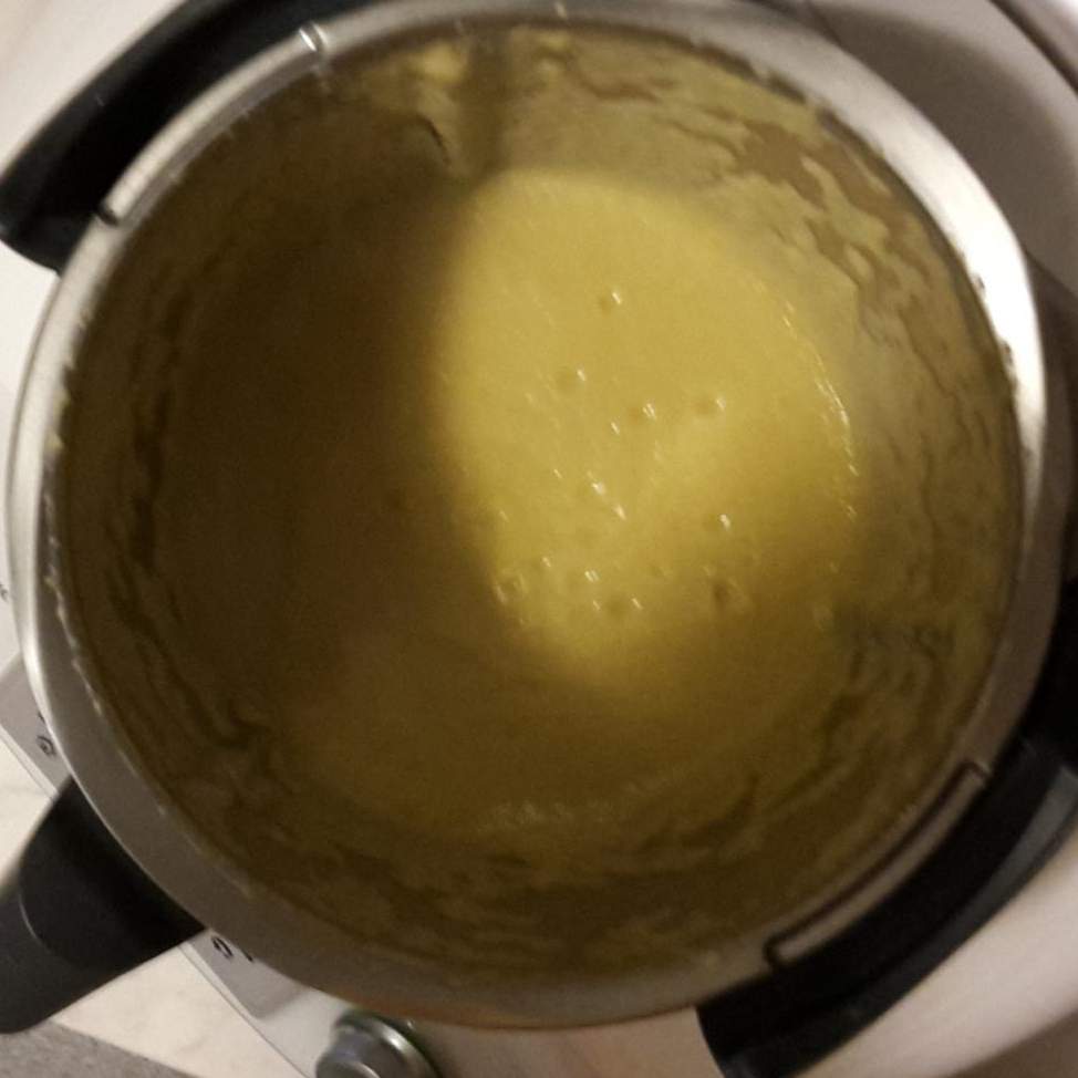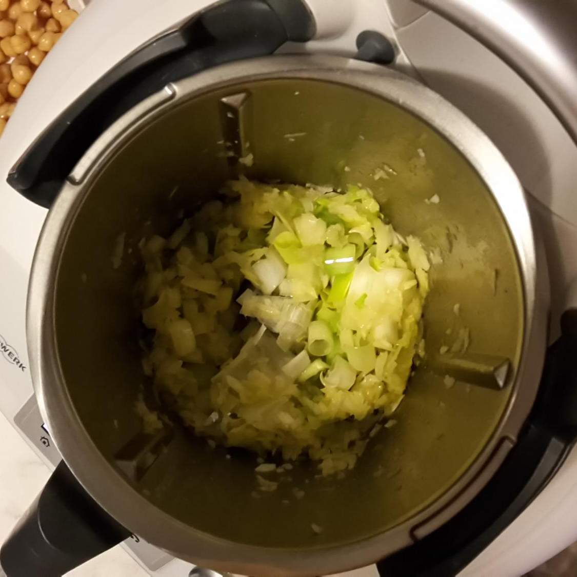 "coperchio chiuso" . Tritare per 8 sec vel 6. Riunire sul fondo con la spatola. Aggiungere l'olio e i porri e soffriggere per 3 min 120° vel 1.