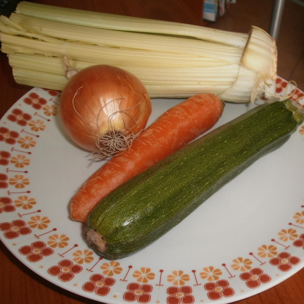 Tagliare a pezzettoni la verdura (carota zucchina cipolla sedano), mettere tutto nel