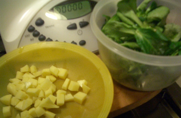 "coperchio chiuso" lo scalogno e le foglie di finocchio tagliate in 4, tritare 5 sec vel 6, abbassare sul fondo, inserire la valeriana, la patata tagliata a cubetti piccoli, l'acqua, il dado e cuocere: 20 min 100° vel 1. Far riposare 5 min e frullare passando da vel 8, 10 sec a vel 10 20 secservire con crostini di pane tostato in forno