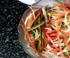 in precedenza preparare le crudirèes tagliando le verure a juliemme e metterle in acqua fredda in frigorifero per alcune ore per intostarle. Prima di posizionarle centrifugare bene e tamponare con un canovaccio