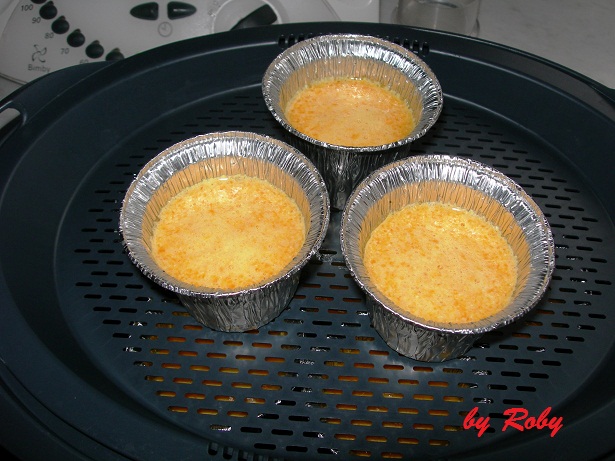 - Versare il composto in pirottini monodose di alluminio imburrati, riempirli fino a ¾ e disporli nella campana del varoma e nel varoma;