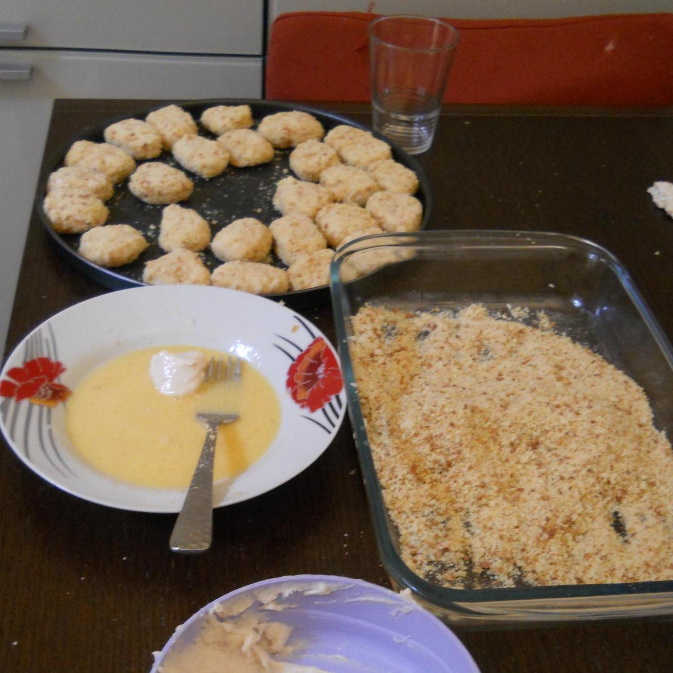 Con le mani bagnate formate i nuggets e passatele nell'uovo che è stato sbattuto con l'acqua e poi nel pan grattato.