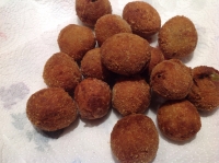 Friggere le olive in olio di semi di arachide bollente, girandole con delicatezza fino a quando non saranno dorate uniformemente.