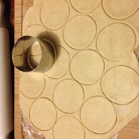 Stendere la pasta con il mattarello e formare dei dischetti con il coppapasta.