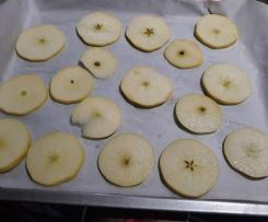 - Per prima cosa dovete lavare 2 mele e tagliarle a fette e passatele nel succo di limone scolate bene e mettere su placca forno con carta forno e con forno caldo cuocere per 1ora e mezza a 100° a forno ventilato di tanto in tanto dovete girare le mele devono essicccare bene fattto questo toglierle dal forno e fatele divenatre fredde