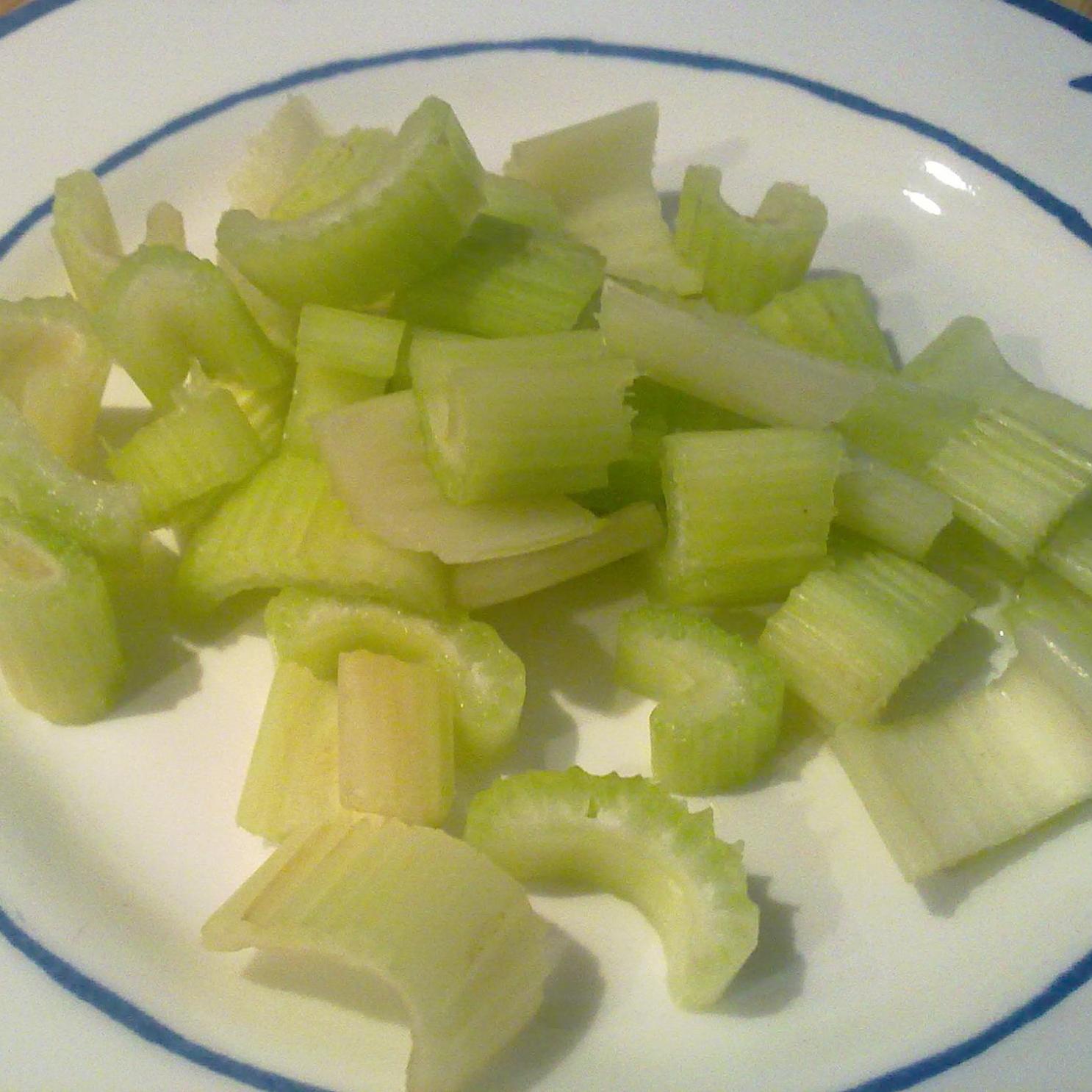 - Sbollentare in acqua salata per qualche minuto il sedano tagliato a rondelle, deve rimanere croccante, sgocciolare e mettere da parte sia il sedano che l'acqua di cottura;