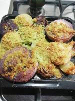 Salare le cipolle in superficie e distribuirvi il composto preparato in precedenza con il pane. A piacere aggiungere un filo di olio.