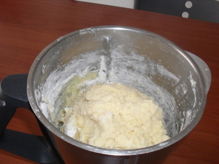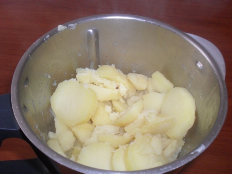 dopo cotte mettere nel boccale 60 gr. Di farina e le patate bollenti