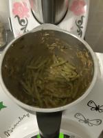- Unire l'olio, la polpa di pomodoro, il sale, i fagiolini (io li ho messi ancora congelati), e cuocere 25 minuti, 100 gradi, velocità soft. antiorario;