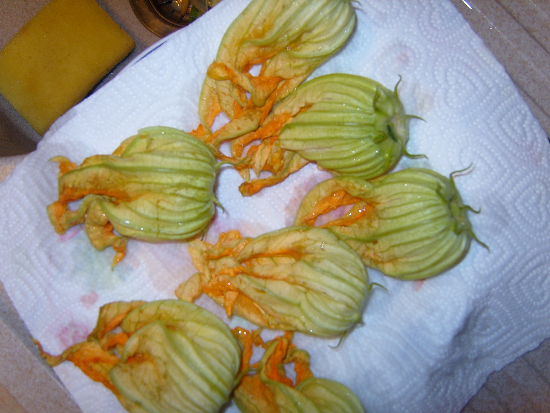 Mettere in acqua fredda i fiori di zucca, asciugarli tamponandoli delicatamente. Aprirli e rimuovere con garbo il pistillo.