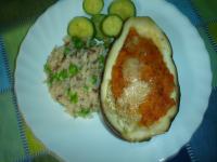 Veramente gustose... due piccole modifiche, in quanto non ho fatto il sugo nel boccale e quindi ho messo l'aglio nel ripieno , e il pangrattato l'ho amalgamato col bimby a fine cottura del ripieno appunto, aggiungendo anche basilico. Sopra ho cosparso con parmigiano grattugiato. Intorno nella campana ho sistemato delle zucchine a rondelle avendo fatto una sola melanzana (due metà) Nel boccale ho messo acqua e sale e ho cotto nel cestello cereali e piselli.. ho fatto metà dose ..e ho cotto a varoma per 30 minuti.... spettacolari