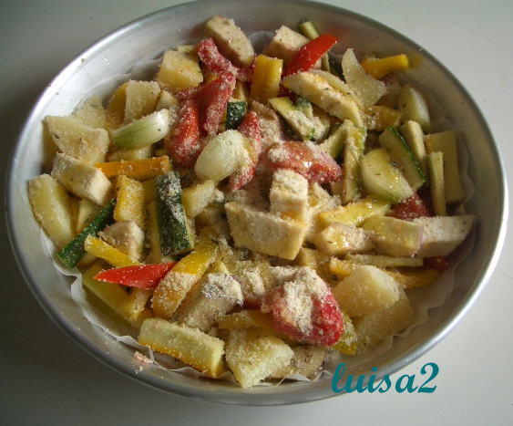 Foderare una teglia con la carta forno, mettervi le verdure tagliate a tocchetti, insaporirle con metà del trito preparato, salare e pepare, stenderle senza sovrapporle, cospargerle con il restante trito e un filo d'olio, cuocere in forno caldo 180° per 30 min