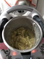 Al termine togliere varoma e cestello.Mettere nel boccale la cipolla e tritarla 3 sec. vel.5. riunire sul fondo con la patola,aggiungere l'olio e insaporire 3min. 120 vel.1