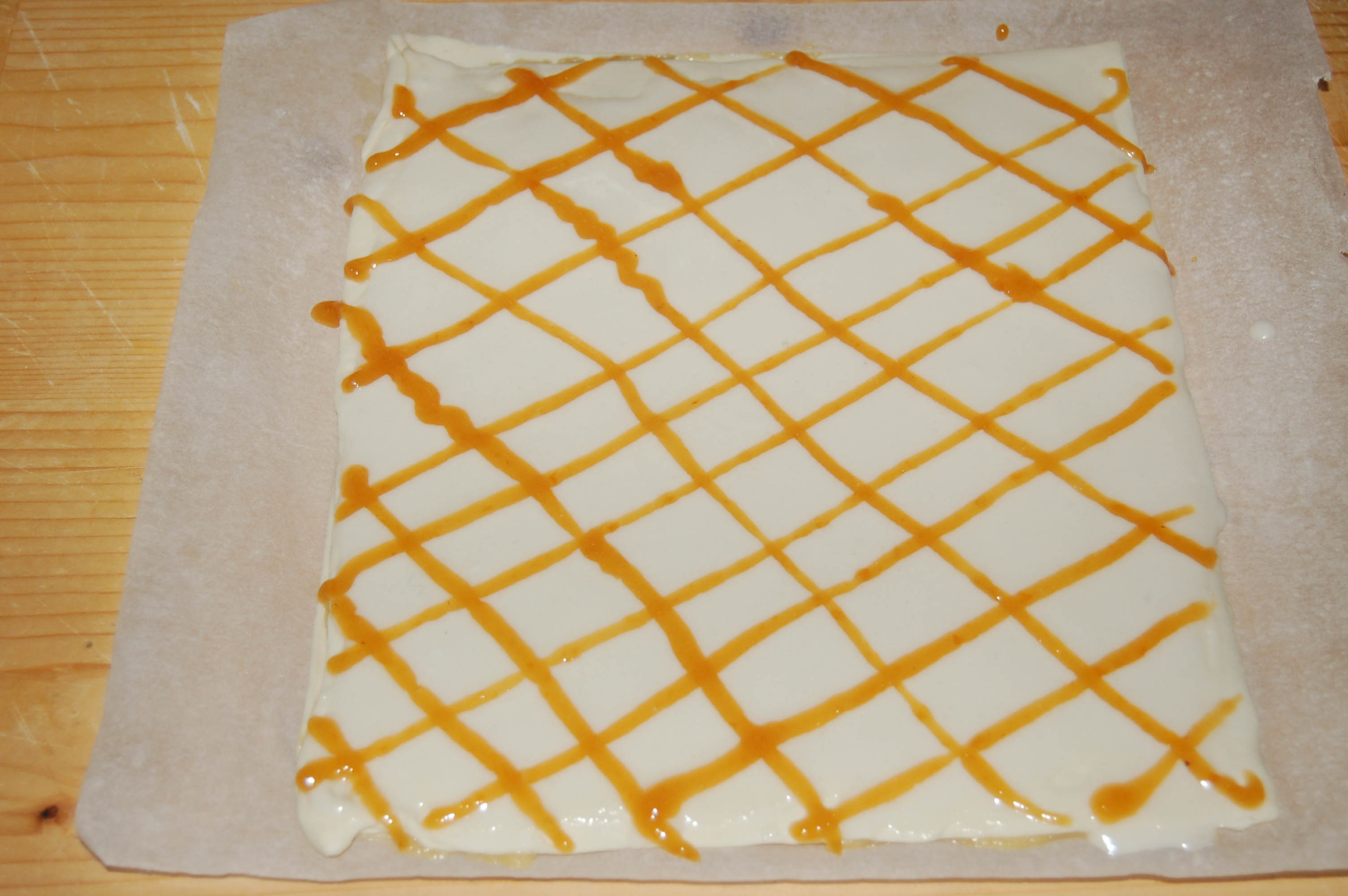 Stendere metà della pasta sfoglia allo spessore di circa 2 mm a formare un rettangolo/quadrato il più possibile regolare. Tagliarlo a metà e spalmare una delle due parti con metà della crema frangipane (uno strato di 2 mm circa). Porre l'altra metà della sfoglia sopra lo strato appena spalmato e spatolarvi sopra metà della glassa. Mettere qualche cucchiaiata di marmellata di albicocche in una sacca da pasticcere a bocchetta piccola e liscia e disegnare un reticolo in diagonale sopra la glassa. Ripetere la stessa operazione con la restante pasta sfoglia.