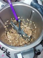 Mettere nel boccale burro, zucchero e miele, mettere la farfalla per far rimsecolare bene, chiudere ed impostare sui 5 minuti di cottura a circa 80 gradi. La temperatura non deve essere alta per non far caramellare gli zuccheri, gli ingredienti si devono semplicemente sciogliere. Quando viene una bella salsa liquida aggiungere dal foro i cereali e far amalgamare a vel. 1 o per chi ha il TM31 va benissimo antiorario soft perchè i cerali non devono sbriciolarsi.