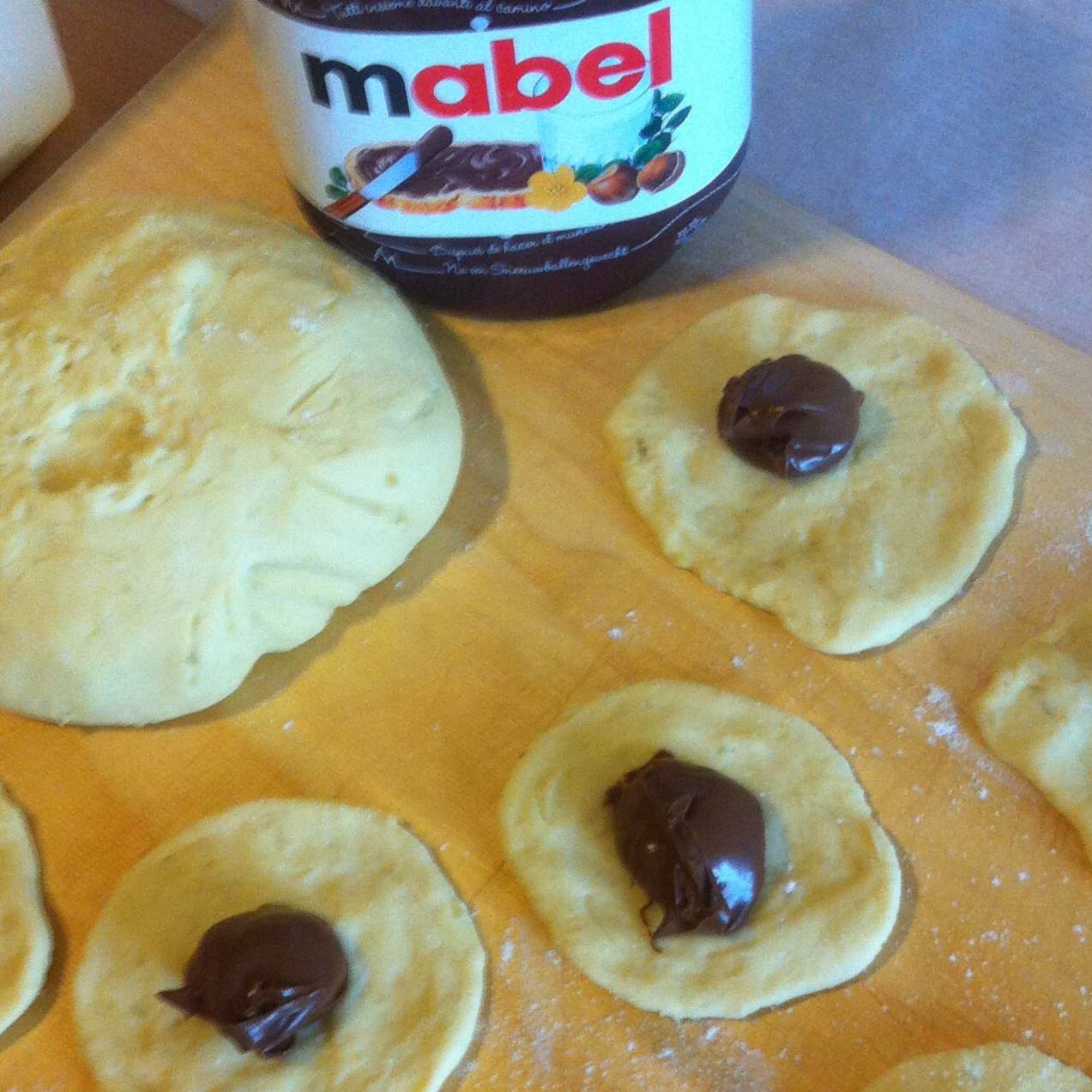 Mettere un cucchiaino di ripieno (io uso la Nutella) al centro del dischetto.