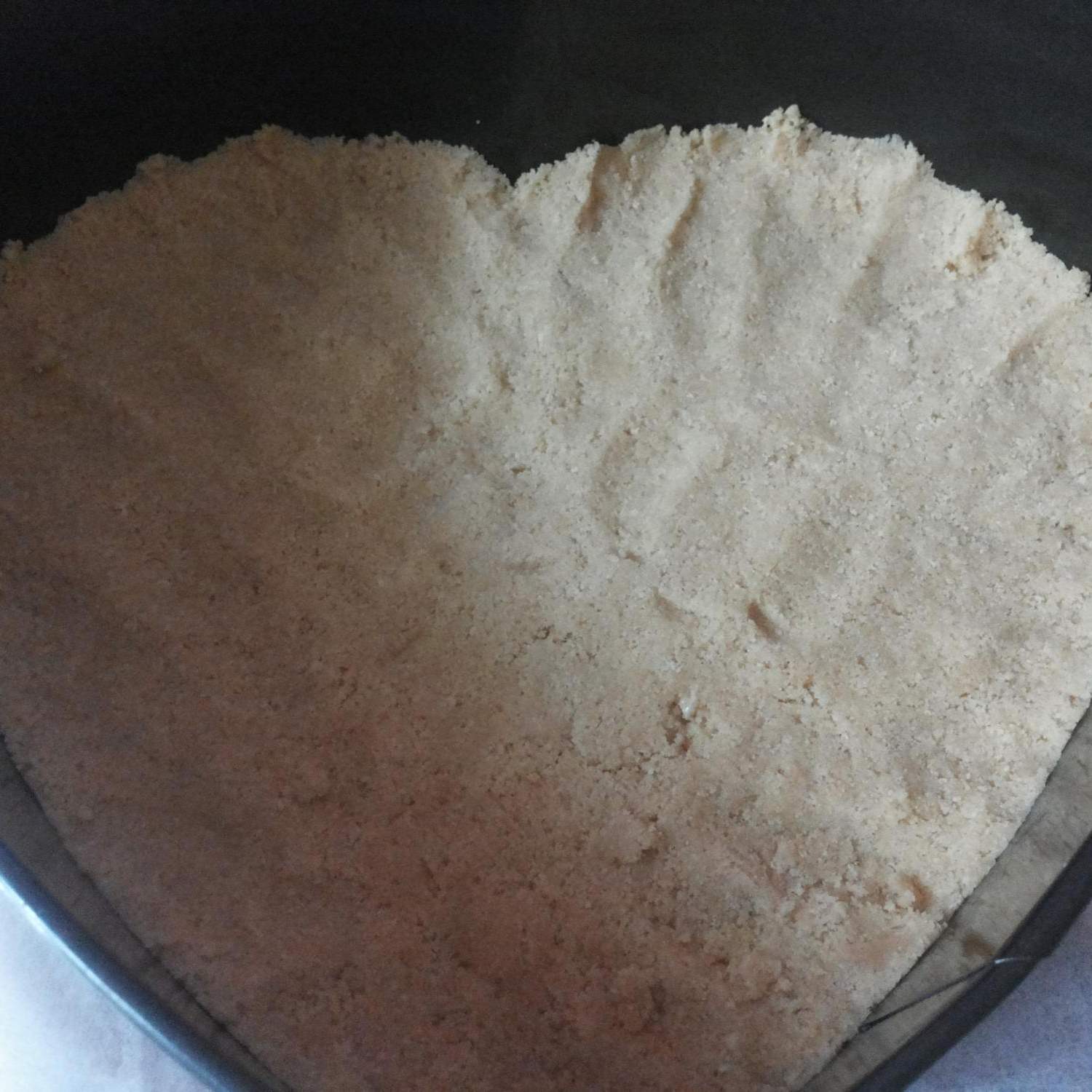Foderare una tortiera a cerchio apribile con carta forno, metterci il trito di biscotti e schiacciare bene con le mani. Mettere in frigo.