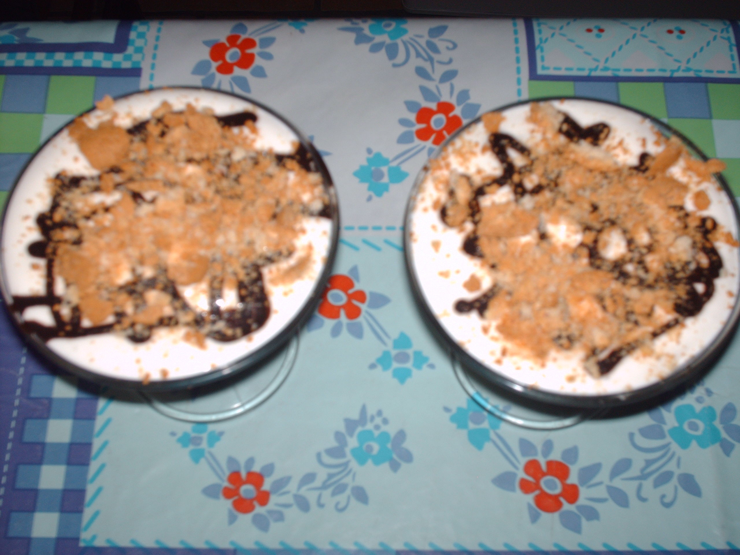 Ho preso due coppette da gelato e ho colato dentro un pò di topping girando il bicchiere per sporcarlo e messo in frigo a solidificare,riprendiamo le coppette mettiamo la crema (erano più o meno 6 cucchiai) copriamo con la panna e decoriamo con topping e amaretti.
