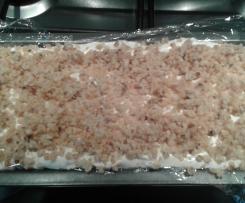 Versare il composto nella forma da plumcake distribuendo sopra una parte di croccante.Mettere in freezer per 4 ore. Prendere il dessert dal freezer e capovolgerlo su di un vassoio. Completare con del topping e il resto del croccante. Decorare con il ribes.