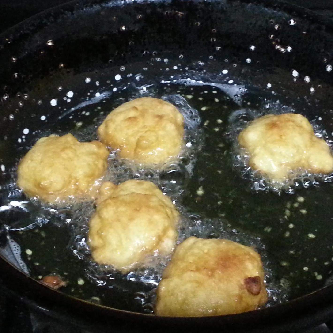 Prendere l'impasto a cucchiaiate e friggere finchè saranno ben dorate rigirandole.