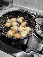In una padella portare a bollore l'olio e formare delle palline da friggere girandole quando sono dorate, scolarle con una schiumarola e metterle in una ciotola con carta assorbente per far perdere olio in eccesso.