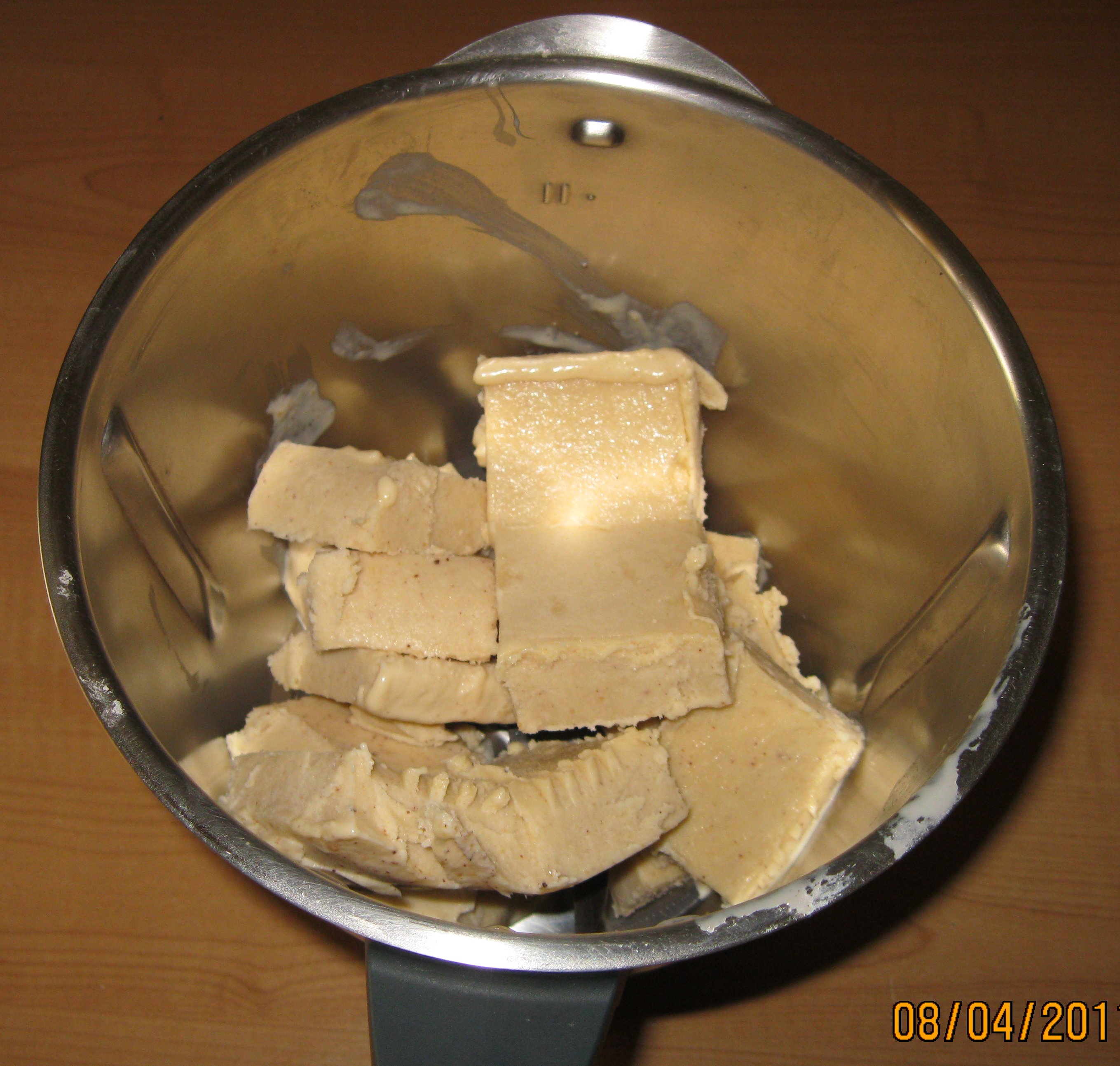 un suggerimento per chi ha il tm5: non penso sia necessario fare i due passaggi di mantecatura perchè il boccale è più grande dei modelli precedenti. Io infatti ho seguito alla lettera la ricetta, facendo le due matecature, ma la spatola neanche toccava il gelato nel boccale perchè ce n'era troppo poco.