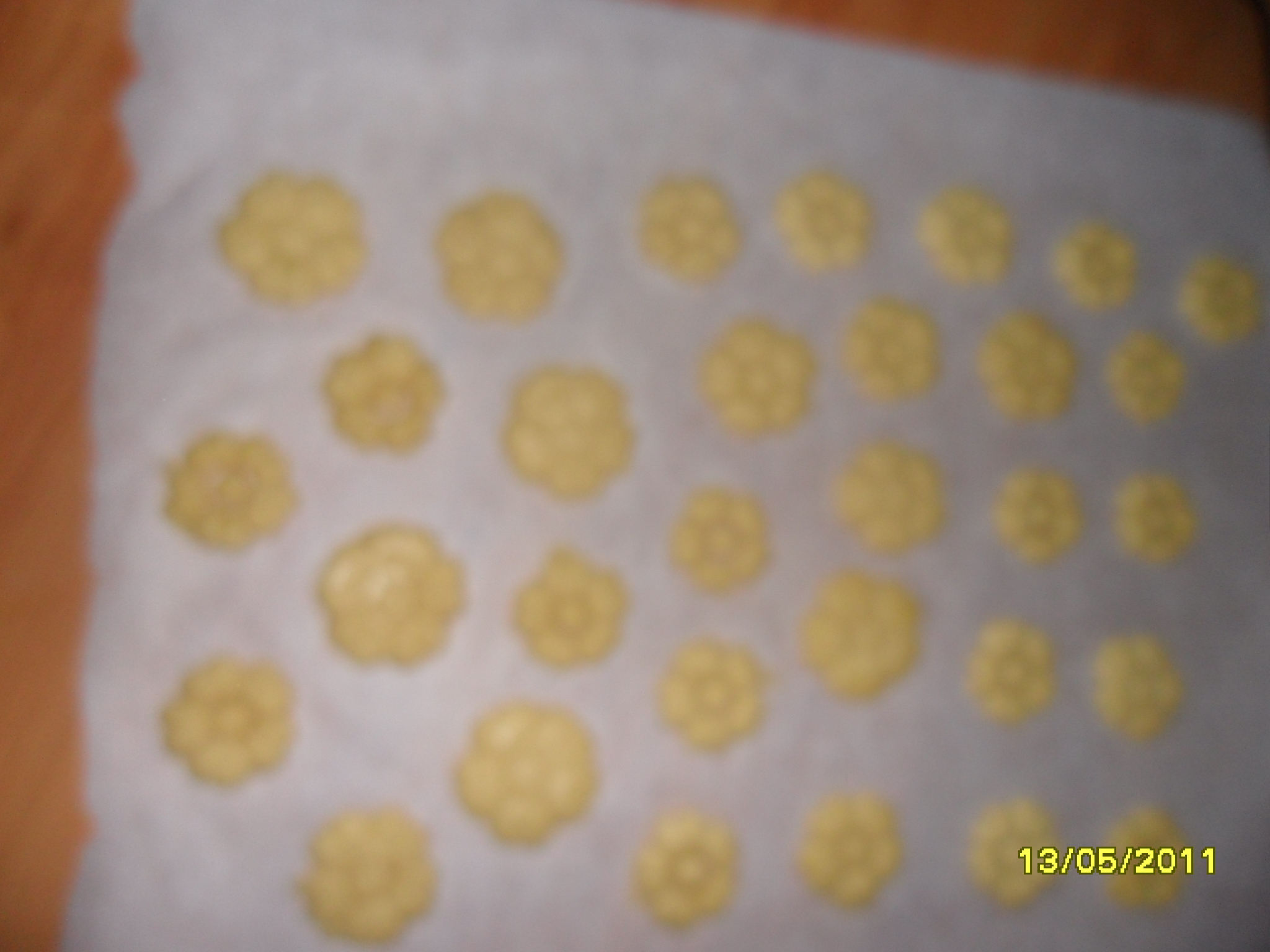 su una teglia foderata con carta forno iniziamo a fare i biscotti con la sparabiscotti nelle forme desiderate.