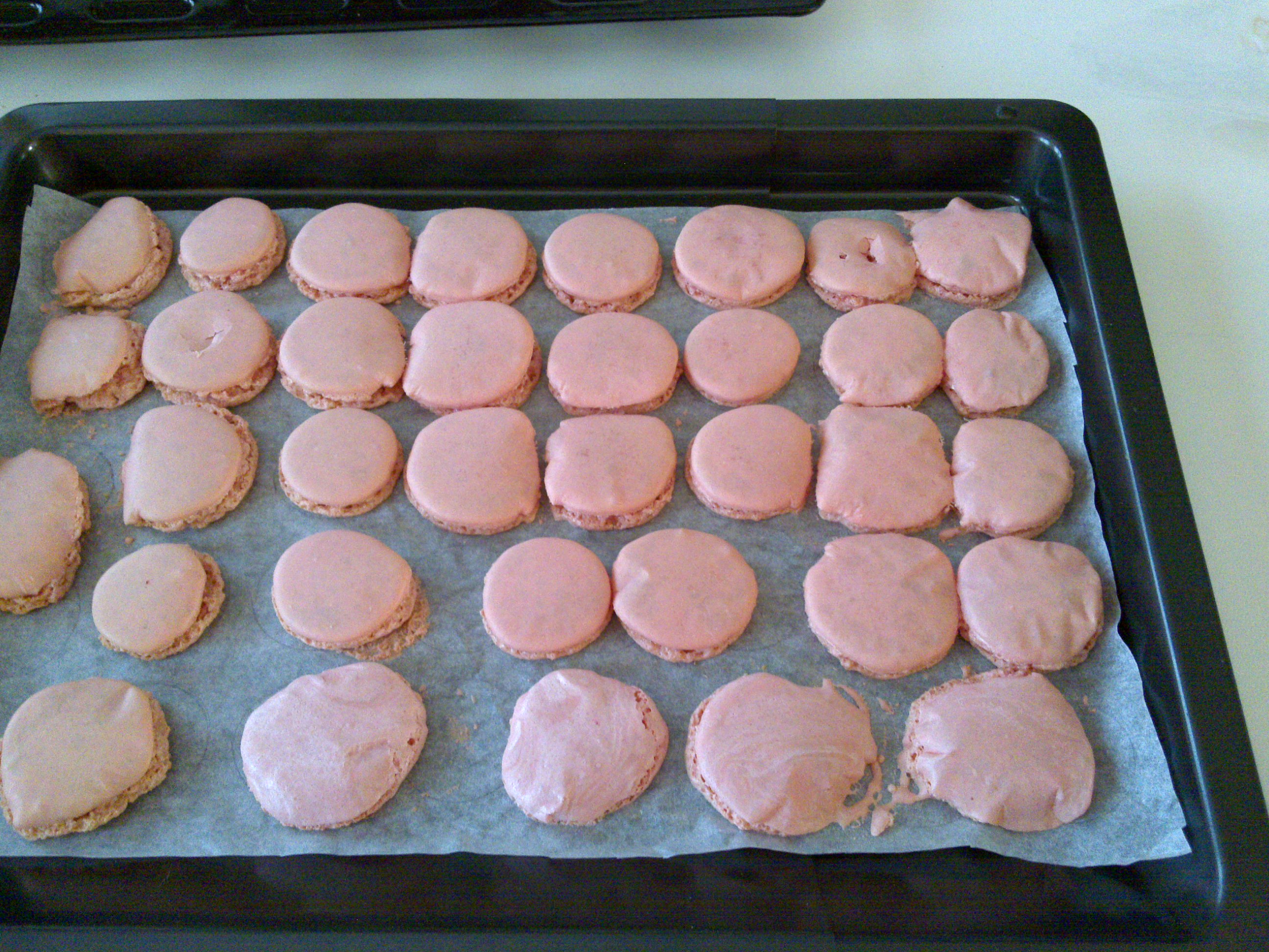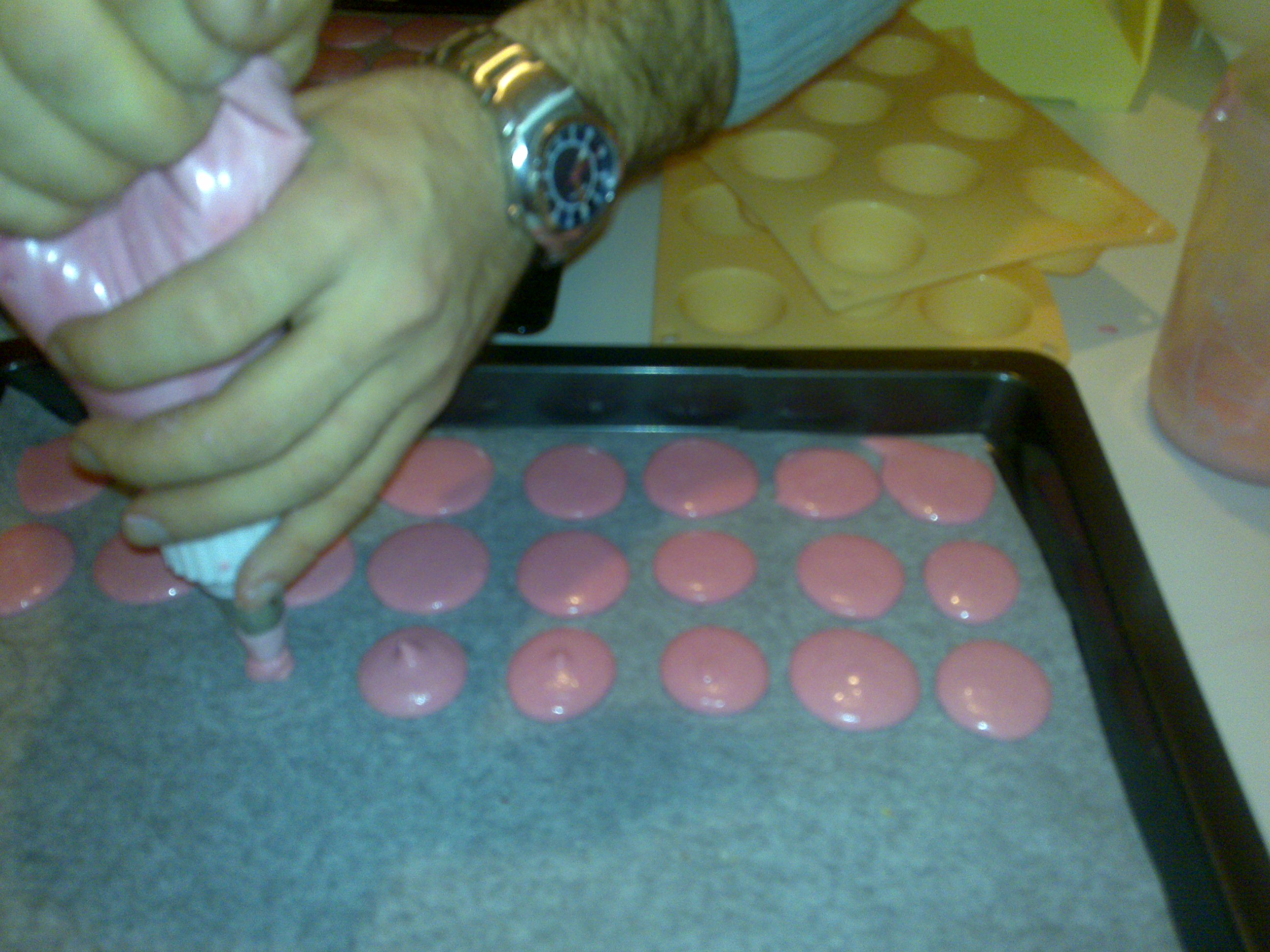 "coperchio chiuso" la farfalla, versateci 75 gr di albumi e i 40 gr di zucchero restanti, cominciate a montare 2 min. vel 4. Intanto lo sciroppo di zucchero dovrebbe essere pronto, impostate ancora 2 min. vel. 4 e cominciate a versare a filo lo sciroppo mentre monta, la meringa sarà pronta quando diventerà solida come la panna montatata.Incorporate gli ultimi 75 gr di albumi alla farina di mandorele e zucchero a velo e aggiungete il colorante a gocce, regolatevi in base al colore che volete ottenere, aggiungete poco alla volta la meringa, amalgamate bene e versate il tutto in una sacca a poche con beccuccio liscio di 6 mm; Sulla carta da forno formate dei dischetti di circa 4 cm di diametro e distanziateli tra loro di 2-3 cm, lasciati riposare 30-60 minuti. Preriscaldate il forno a 150° ventilato, dopo 15 minuti inserite le piastre con i macarons una alla volta e cuocete per circa 13 minuti, state attente perchè potrebbero cambiare colore se si tengono troppo, sono pronti quando si staccano facilmente dalla carta. La scialeli raffreddare Versate la Ganasce nella sacca a posche e farcite la metà dei dischi coprendoli con gli altri.