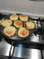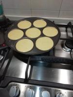 Imburrare un padellino antiaderente, scaldare sul fuoco e versare un piccolo mestolino di impasto.