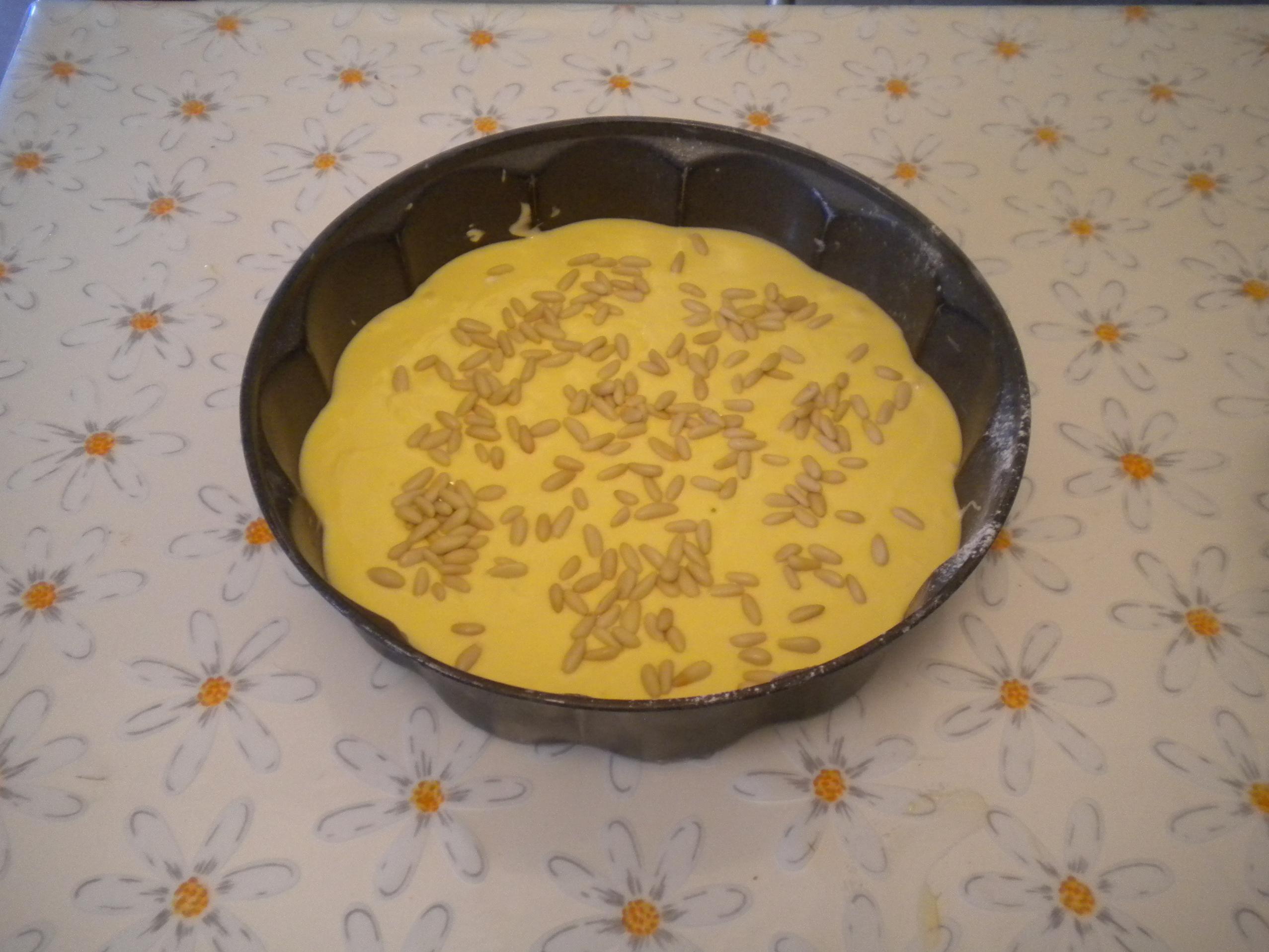 Versare il composto ottenuto in una teglia da 24 cm precedentemente imburrata ed infarinata, aggiungere i pinoli e cuocere in forno preriscaldato a 180° per 35/40 min circa,dipende dalle caratteristiche del proprio forno. Sfornare comunque dopo aver fatto la prova stecchino.