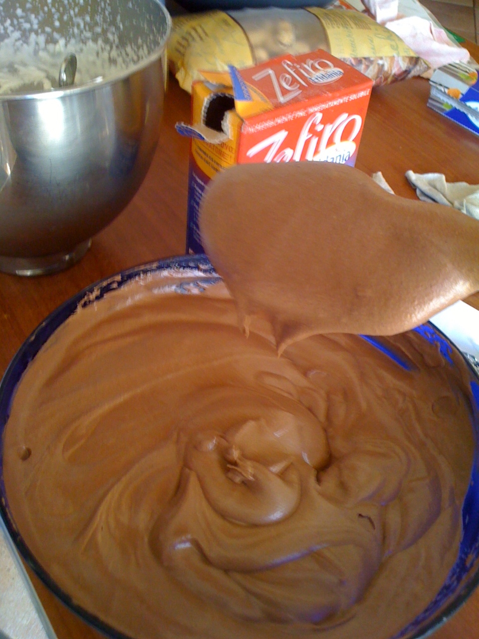 Montare 750 gr. di panna io la zucchero sempre con un pò di zucchero a velo e aggiungerla poco alla volta dal basso verso l'alto alla salsa di cioccolato deve diventare un composto spumoso e sodo come si vede nella foto.