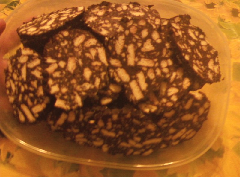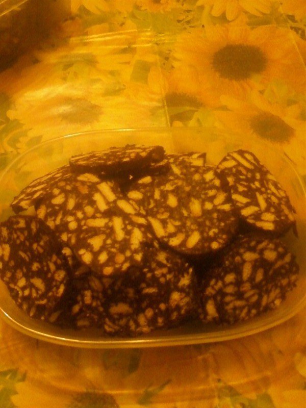 per 1 minuto.Versare il composto in una ciotola, incorporando i biscotti tritati e mescolando fino ad ottenere un impasto morbido, quindi disporlo sulla carta da forno dando la forma di un salame arrotolandolo ben stretto.