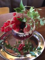 - Sul fondo del bicchiere disporre qualche chicco di ribes e sopra qualche cucchiaiata di sorbetto di more, sopra questo disporre qualche mora e sopra ancora qualche cucchiaiata di sorbetto al Campari;