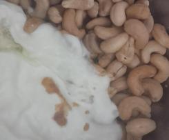 "coperchio chiuso" gli anacardi sgocciolati,l'olio di cocco, lo sciroppo di agave, lo yogurt, e i semini di vaniglia 30 Sec. Vel. 8. - Versare metà della crema ottenuta sopra la base.