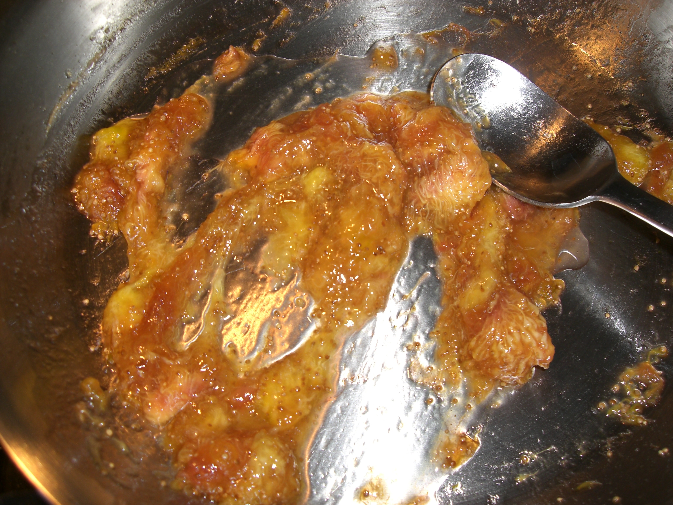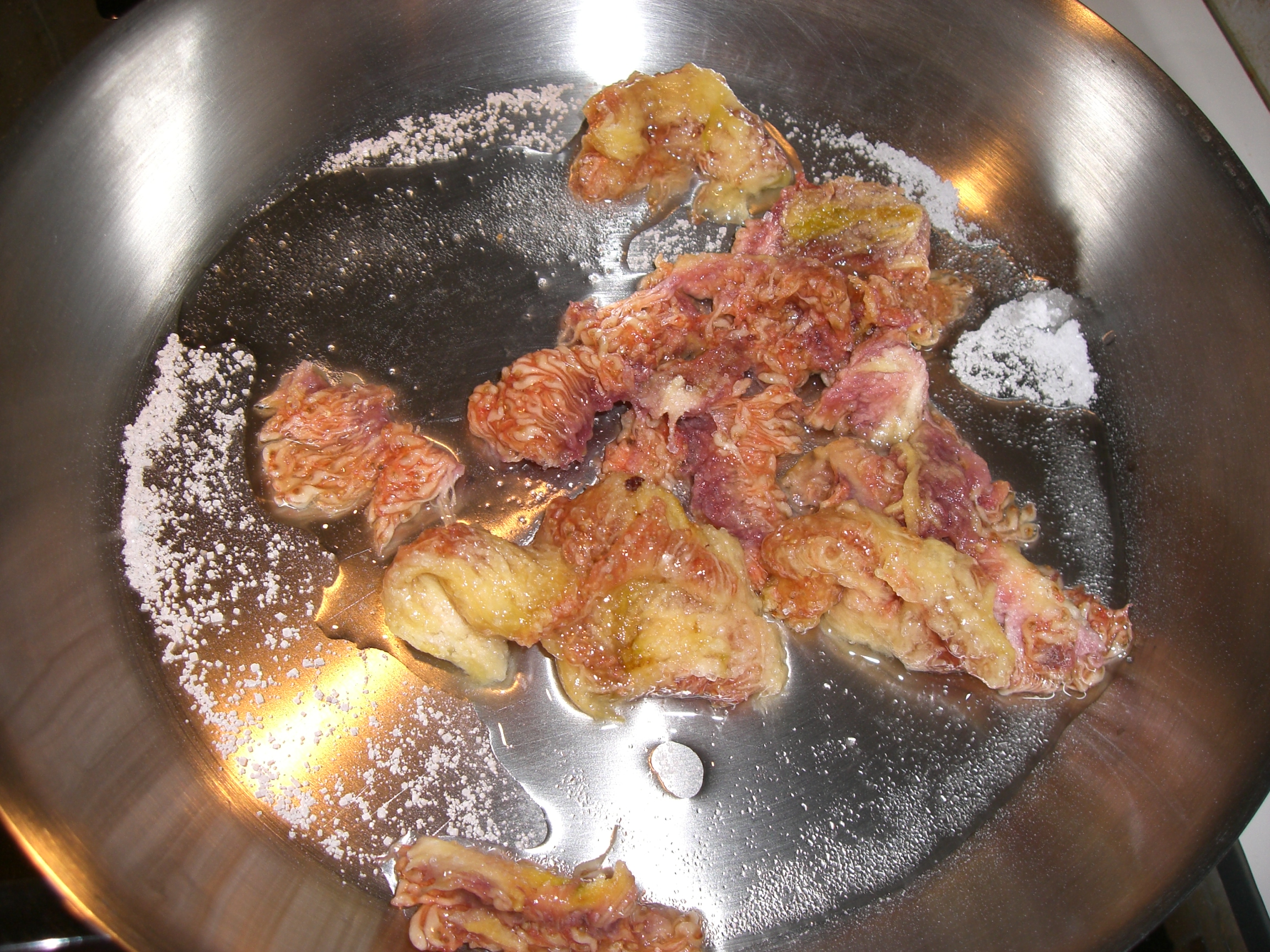Mettere in una padella zucchero parte dell'acqua e i fioroni privati della buccia e tagliuzzati, cuocere a fuoco medio per 3/4 minuti...devono esser caramellati ma non bruciati metterli in una ciotolina a raffreddare, nella padella inserire il resto dell'acqua e far andare a fuoco medio per circa 2 minuti e poi aggiungere ai fioroni messi da parte, questa operazione serve a "recuperare" tutto lo zucchero e i fichi rimasti nella padella.