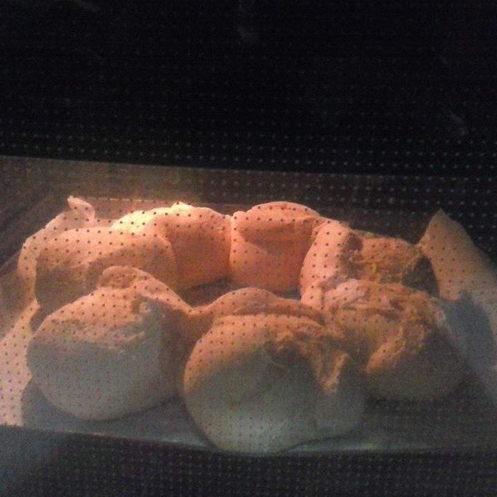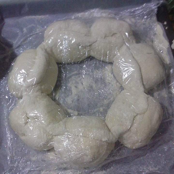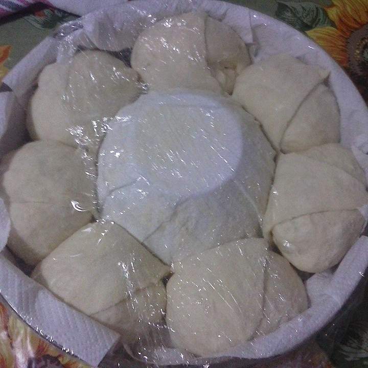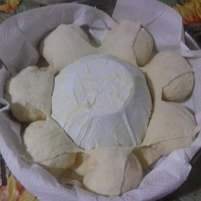 5. Prendere la pallina più grande e stenderla col matterello e poggiarla sulla ciotolina capovolta facendo andare la pasta di  circa 2-3 cm oltre il bordo della ciotolina. Posizionare le palline tutte attorno.Tagliare la pasta sulla ciotola a spicchi in corrispondenza di ogni pallina e ribaltarli su  queste ultime. Mettere a lievitare, coperte da pellicola, per una-due ore in forno spento con luce accesa.