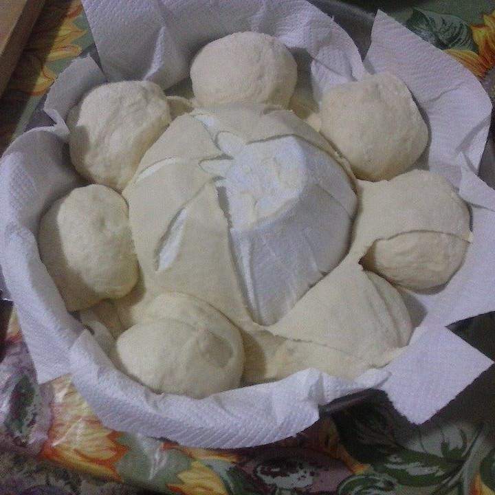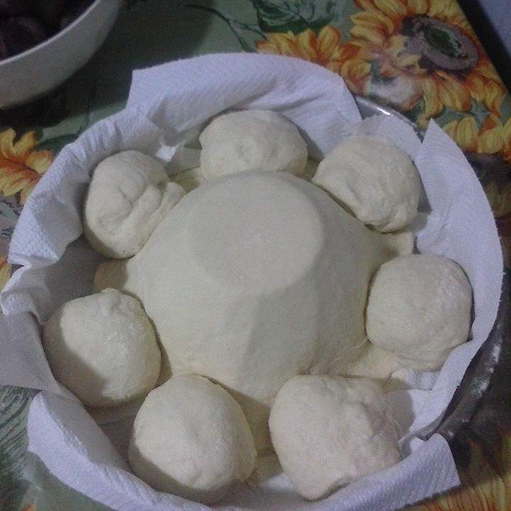 4. Ricavare dalla pasta  una palla grande di circa 130-140 gr e il restante impasto dividerlo in palline da 100 grammi. Prendere una teglia rotonda con un bordo alto di 28-30 cm di diametro; metterci al centro un ciotola  più piccola capovolta (io di 10- cm di diametro) e ricoprire o con scottex oppure con un telo neutro infarinato per bene ( non lavato con detersivi o ammorbidenti altrimenti il profumo vi rovinerà il sapore del pane!).