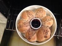 6. Prendere la corona, capovolgerla (la parte con gli spicchi va sotto) nella teglia dove verrà cotta e farla riposare 10-15 minuti coperta da pellicola. Preriscaldare il forno a temperatura max e quando è caldo, vaporizzare un po' di acqua all'interno per creare vapore e infornare il pane. Cuocere in forno statico per 25-30 minuti. Regolatevi col vostro forno e fate sempre la prova stecchino. Far riposare in forno spento per 5-10 minuti con sportello semi-aperto, per fare asciugare bene il pane.