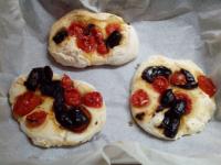 Variante gustosa: panino alle olive e pomodorini! Dopo la prima lievitazione, formare dei panini aiutandosi con cartaforno e farina e inserire qualche oliva nera disossata e pezzetti di datterino, ecco il risultato!