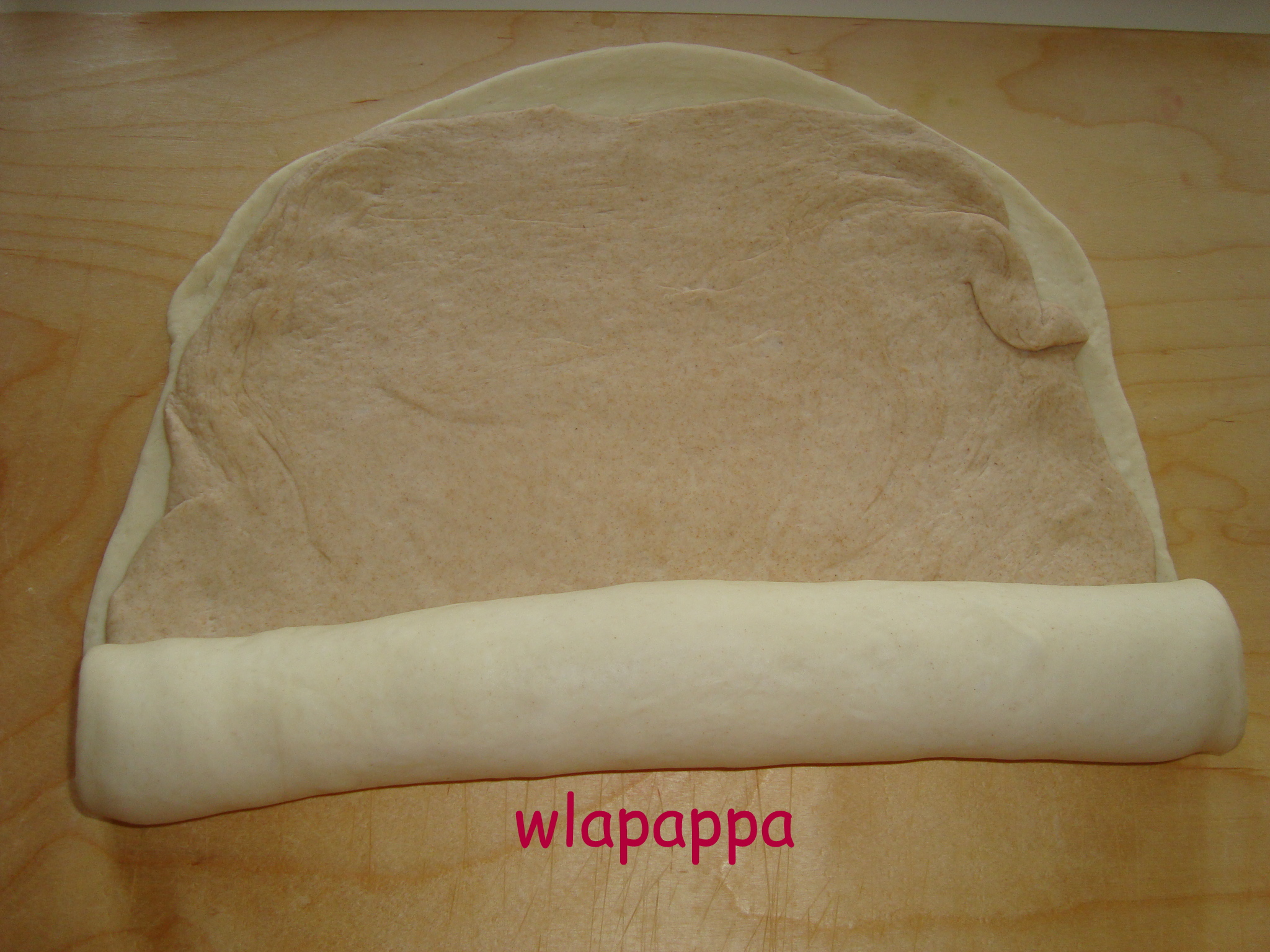 "velocità spiga" . Mettere l'impasto in una seconda ciotola, fare un taglio a croce, coprire con la pellicola trasparente e metterlo a lievitare assieme a quello al farro. Sgonfiare gli impasti lievitati e stenderli, separatamente, con il mattarello facendo due rettangoli abbastanza sottili, quello bianco un po' piu' grosso di quello al farro.Adagiare l'impasto al farro sull'impasto bianco e arrotolare.