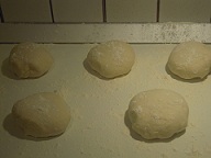 Togliere l'impasto dal boccale (deve essere morbido, liscio e compatto) e formare 5 palline (piu' o meno da 150/170 gr l'una e metterle a lievitare coperte da una tovaglia ben pulita ed una calda coperta di lana per 1 ora e mezzo.