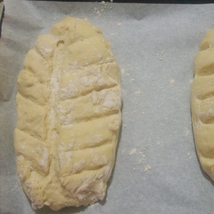 DISPORLI SU UNA PLACCA DA FORNO ED INCIDERE LA SUPERFICIE A SPIGA LASCIARE LIEVITARE ANCORA UNA MEZZ'ORA ED INFORNARE A FORNO CALDO