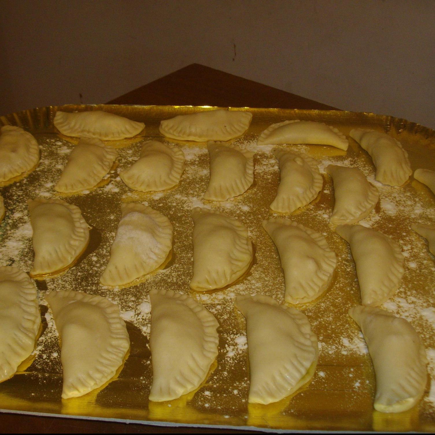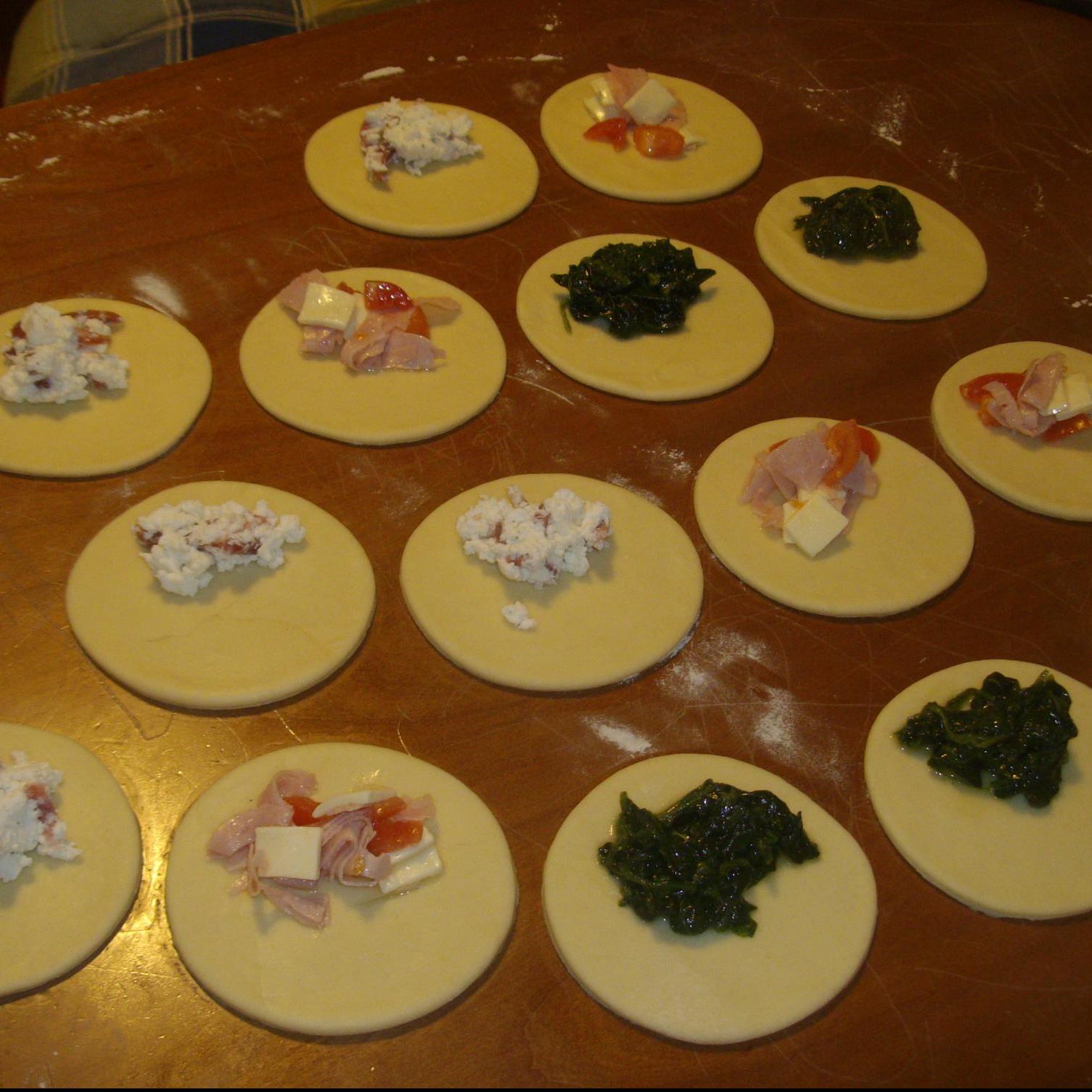 Riprendere l'impasto e stenderlo con il mattarello in una sfoglia sottile aiutandosi anche con un pò di farina,poi con un coppapasta di 10 cm di diametro ricavare tanti dischi.Mettere al centro di ogni disco un pò di ripieno,spennellare i bordi con un pò di acqua e chiuderli siggillandoli con i rebbi di una forchetta.