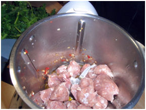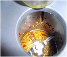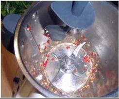 - Tritare nel boccale gli spicchi di aglio e i peperoncini: 7 sec/vel. 7. Riunire sul fondo con la spatola.