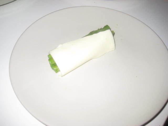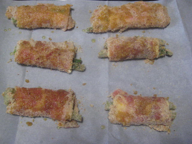 Prendere 3 asparagi per volta, avvolgerli prima con la fetta di formaggio e poi con quella di prosciutto.