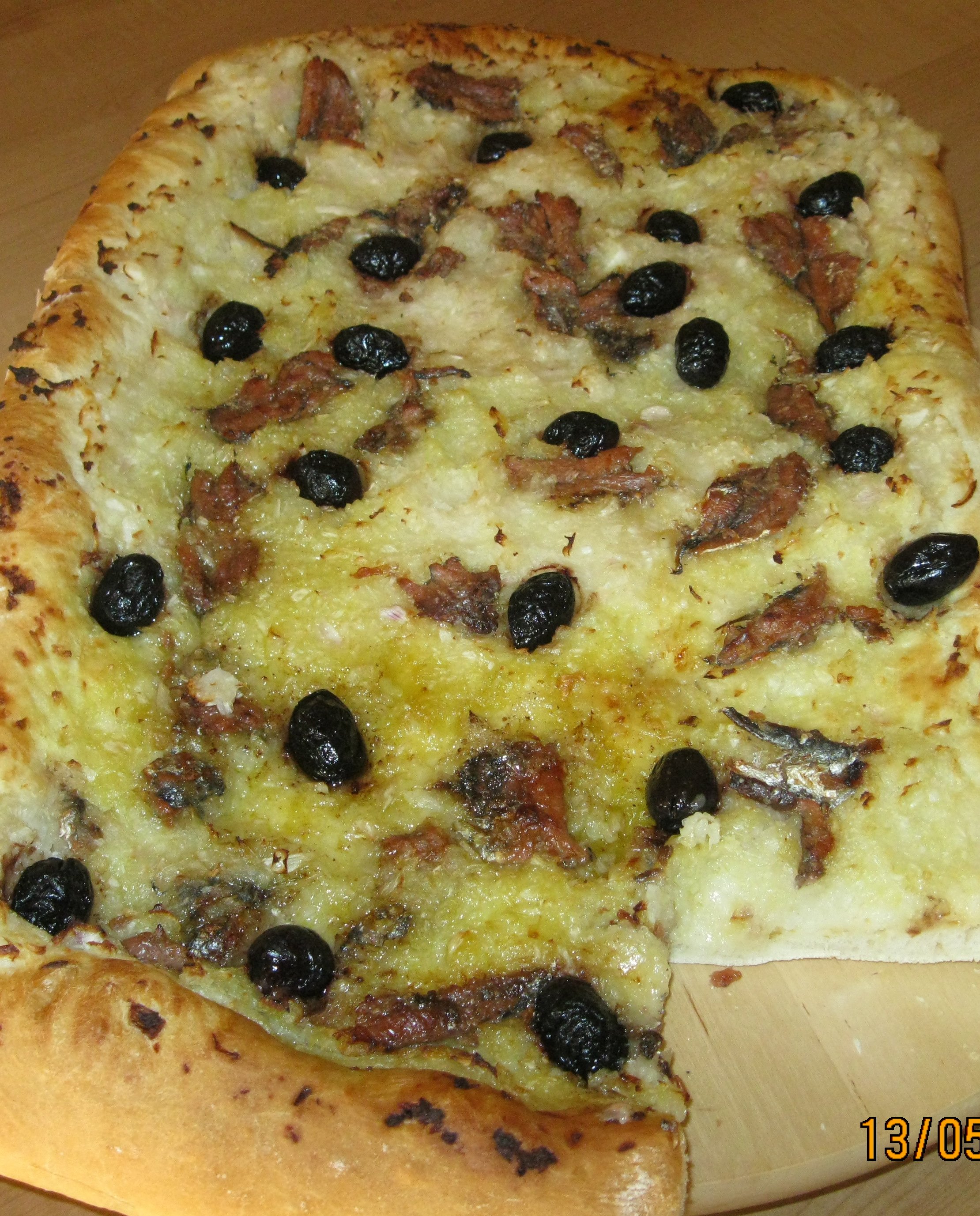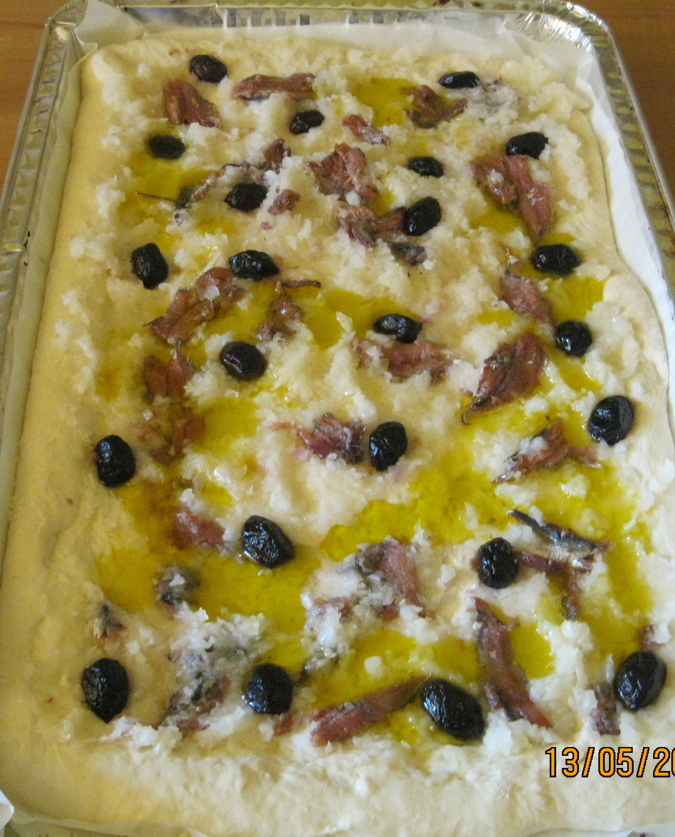 Metà condita come da tua ricetta e metà solo olive (al mio dolce tesoruccio non piacciono le cipolle e le acciughe)..