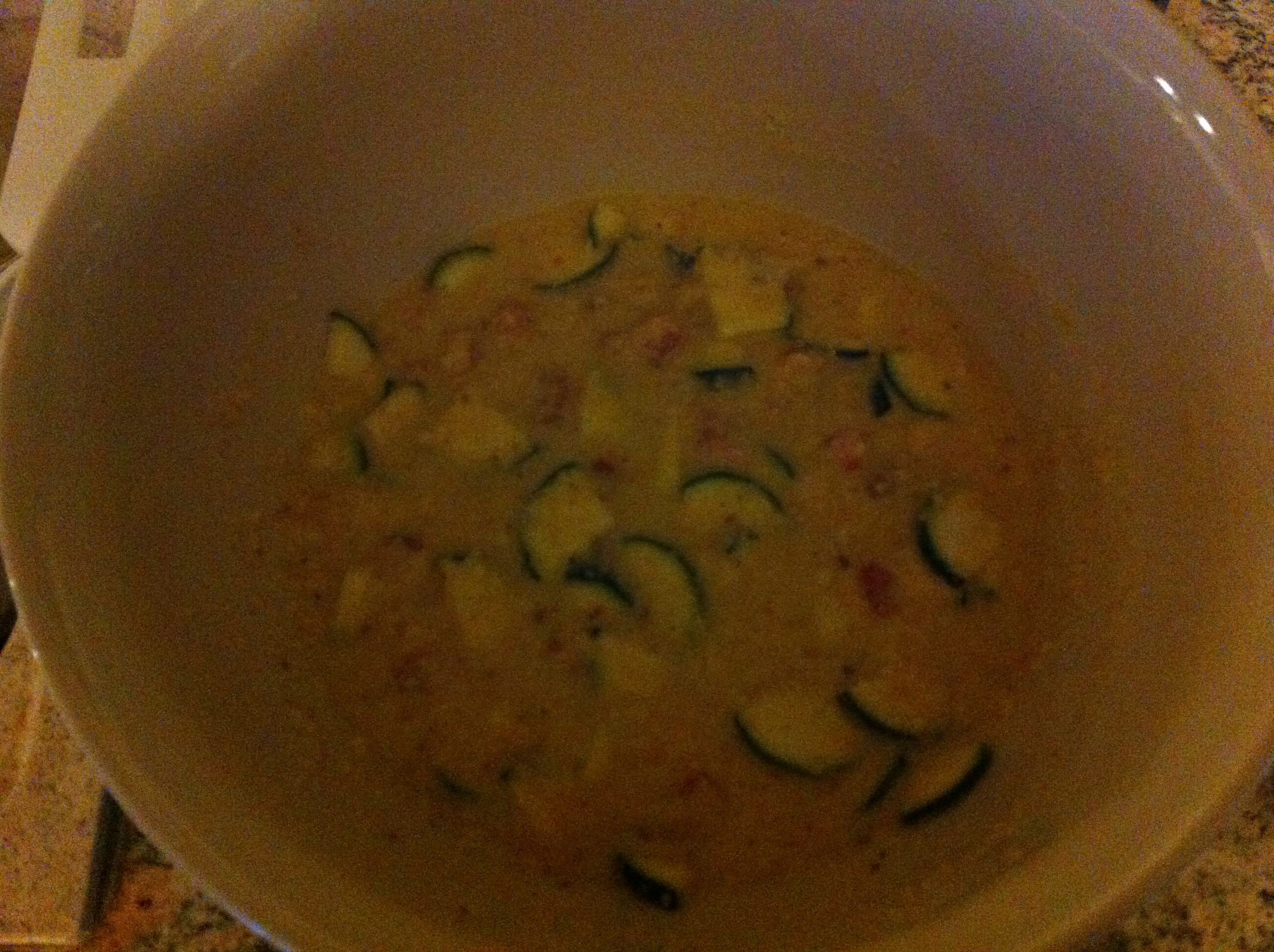 - Tagliare la zucchina a tocchetti piccoli e metterla in una ciotala assieme al composto delle uova amalgamare il tutto e aggiungere sale e pepe;