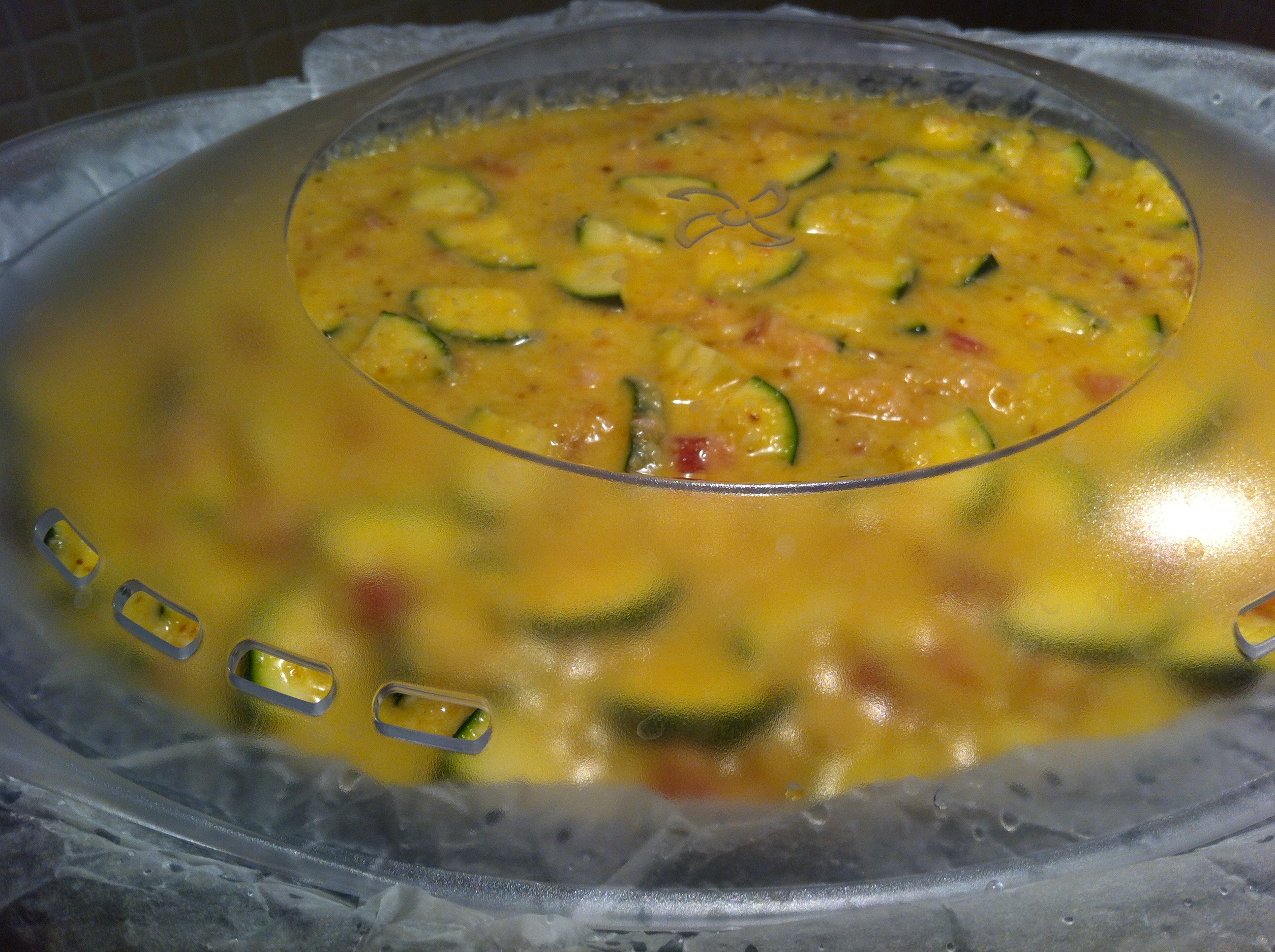- Foderare di carta forno bagnata e ben strizzata il vassoio del varoma, versare il composto di uova e verdura e coprire con il coperchio;