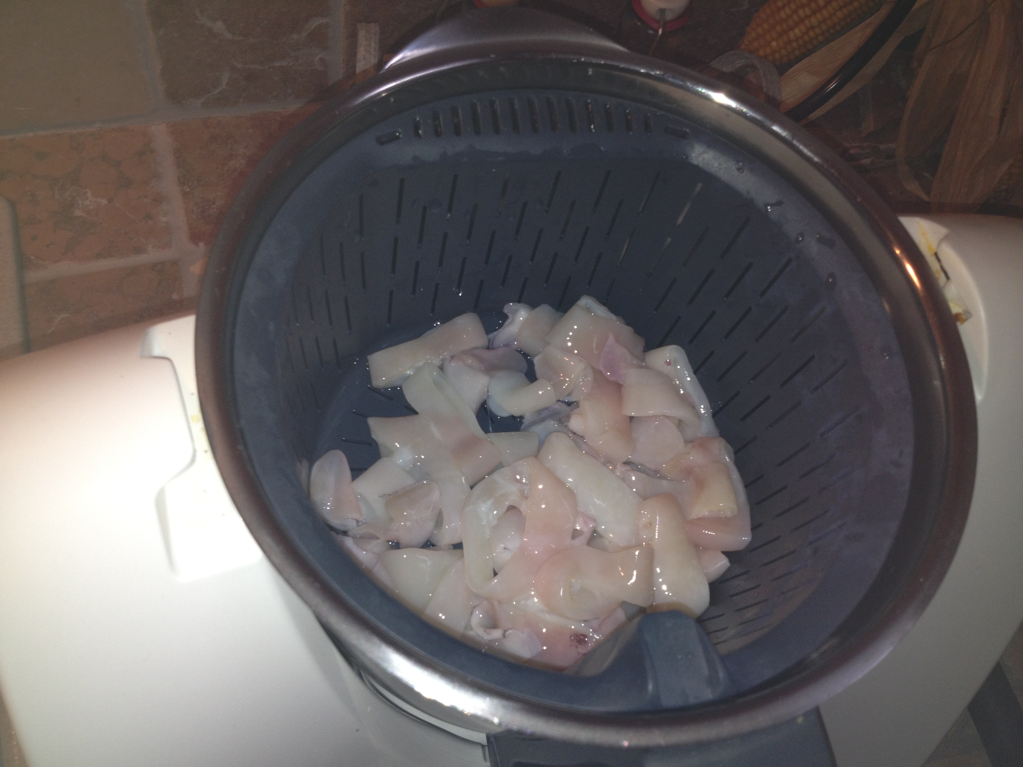 Mettere nel cestello i calamari lavati e tagliati, aggiungere acqua e sale nel boccale cuocere 20 min, 100° vel 1. Lasciare raffreddare.